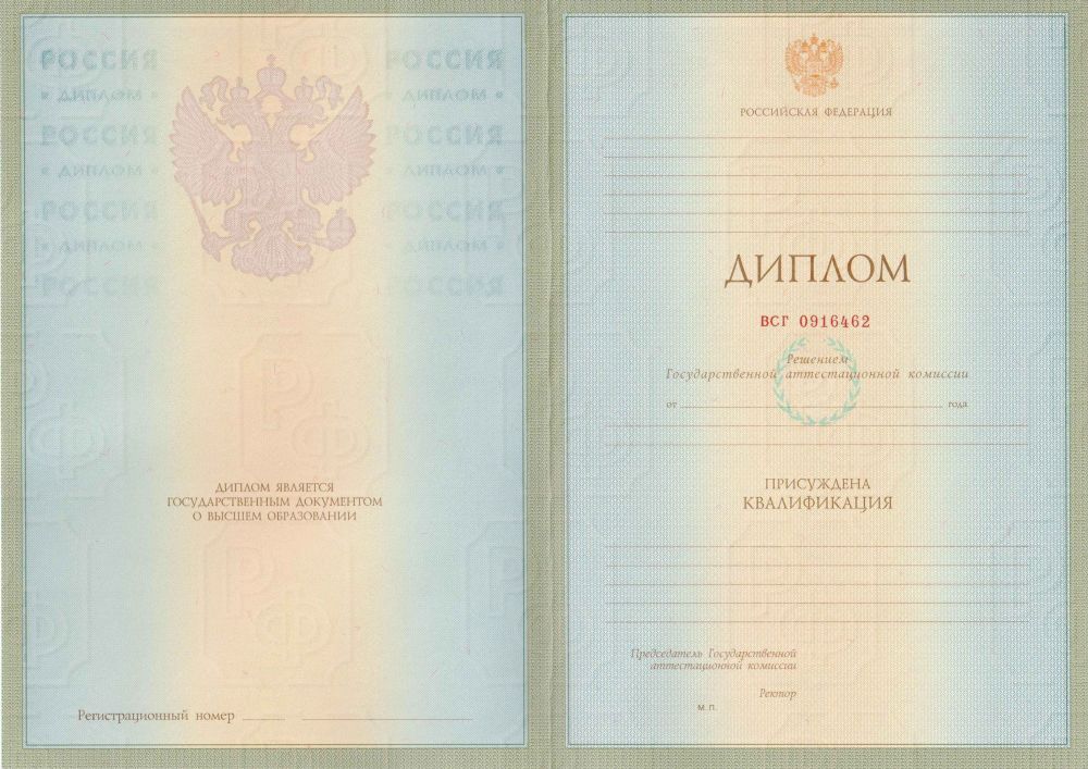 Купив диплома специалиста, клиент получит документ, состоящий из титула и приложения. Титульный лист прикреплен к твердой обложке темно-синего цвета, на которой вытиснены герб Российской Федерации и слова "ДИПЛОМ" и "РОССИЯ". Бланк диплома - это полиграфическая продукция с уровнем защиты "Б" с эксклюзивными водяными знаками. На титуле голубовато - палевого цвета указывается серия документа (ВСГ), а также индивидуальный семизначный номер.